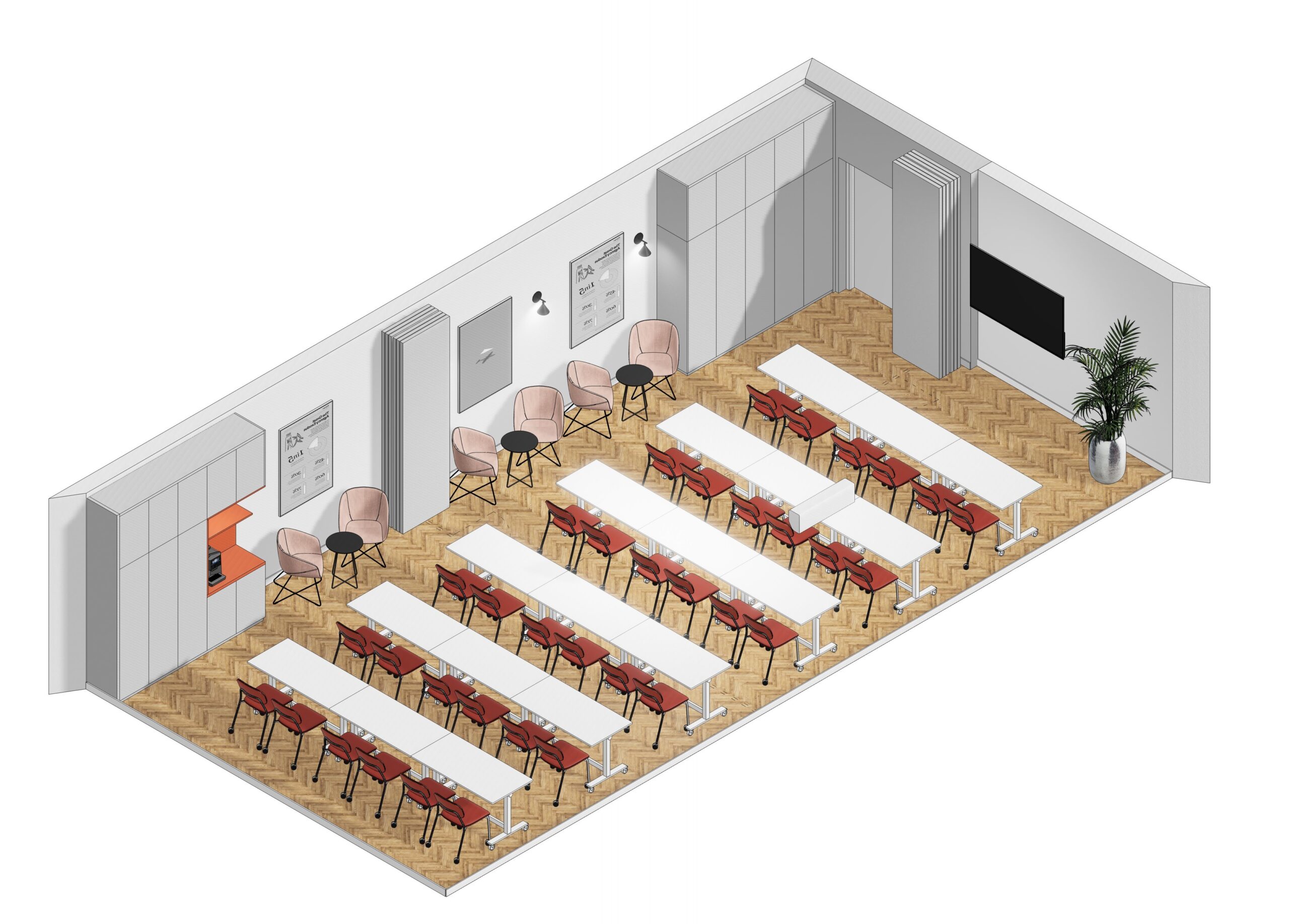 Podział przestrzeni za pomocą składanych ścianek z aranżacją korytarza umożliwiającego komunikację z drugą salą zapewni autonomię i możliwość organizacji dwóch niezależnych wydarzeń.